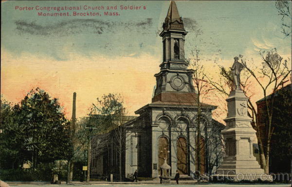 Front: Porter Congregational Church and Soldier's Monument, Brockton, Mass. towe Back: BROCKTO IN O 11-30A 19 Brackton MASS Jane 8 the (c 1915 I'm still here in Emma A - OS Miss Berthu A Goff BOT 104 Attlebore. Messi