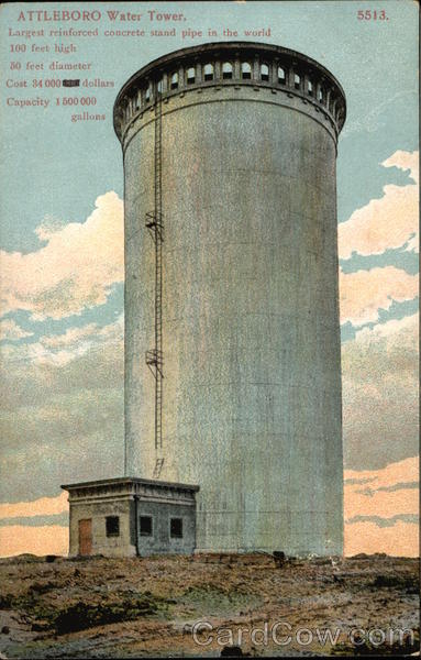 Front: ATTLEBORO Water Tower. Largest reinforced concrete stand pipe in the world 100 feet high 50 feet diameter Cost 34 000 dollars Capacity 1500 000 gallons (95223802 5513. Back: Made in Germany. A. C. Bosselman & Co., New York. Two Cents