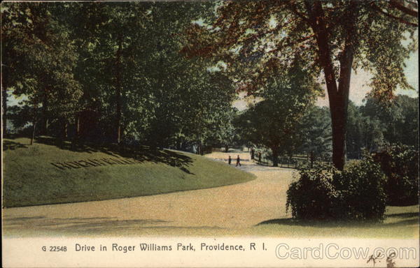 Front: G 22548 Drive in Roger Williams Park, Providence, R I. K.C. Back: Rotograph Co., N. Y., City. (Germany.) RECE RINT ORQ VIDENCE OCT 201 5 30 PM 19. C Mixa Bertha Coeff, attlebors, Marsi NEREEN 1907 1706 FRANKLIN 1790