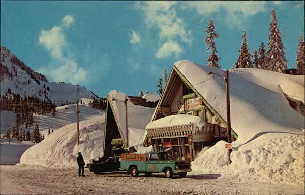 | A winter sun casts its golden glow on Summit Inn - the concession center providing food and comfort to the thousands of skiers who frequent this popular winter sports area. U.S. Highway No. 2 makes the region accessible from both eastern and western Washington |