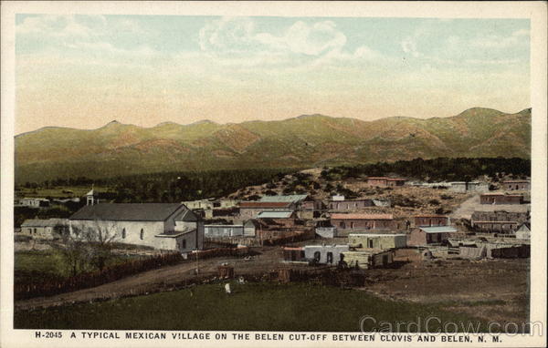 Front: 11.0 11 H-2045 A TYPICAL MEXICAN VILLAGE ON THE BELEN CUT-OFF BETWEEN CLOVIS AND BELEN, N. M. Back: 54084 RED ARVEY COMMERCIALCHROME HERE