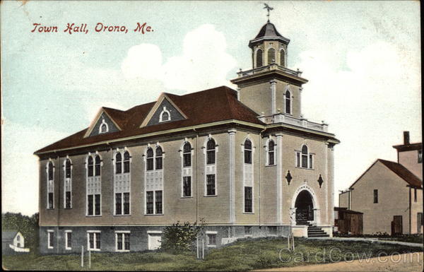 Front: Town Hall, Orono, Me. A LITT + Back: Pub. by O. Crosby Bean, Bangor, Me. For Address. yours truly Hind regarda To M........ Best From: Brut