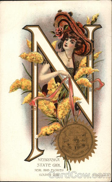 Front: NEBRASKA STATE GIRL SEAL AND FLOWER GOLDEN ROD PLATINACHRONE CO. N.Y. Back: innow where ucho for cards, Car fir madan your Tha No my por me tate DEC 13 BOSCH 15 5 PM E B NE iss Berthall Miss De attlibro Aliff Mass..