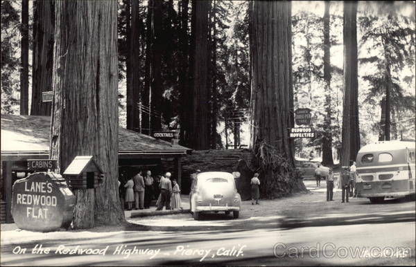 Front: Fo CABINS LANE'S REDWOOD FLAT COCKTAILS GN 89 14 On the Redwood Highway Piercy, Calif LANE'S GOOSE PEN TREE REDWOOD NOVELTIES 1507 Tan R 145 Back: Ekin HERE 1 1947