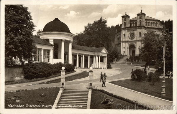 Front: Marienbad, Trinkstelle Rudolfs quelle u. kath. Kirche. Back: Graph. Kunst- u. Verlagsanstalt A. Weber & Co., Stuttgart Nr 155809/200m R 119 Awuco Photographie Echte