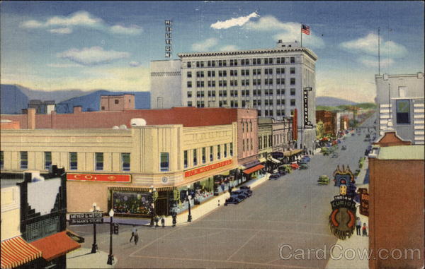 | CENTRAL AVE. AND FOURTH ST. IN THE HEART OF ALBUQUERQUE, N. M. Looking northeast in downtown Albuquerque. Straight ahead is Central Ave., which becomes Highway Route 66 east and west. Fourth St., becomes Highway 85, north to Santa Fe and Taos, south to El Paso, Texas |