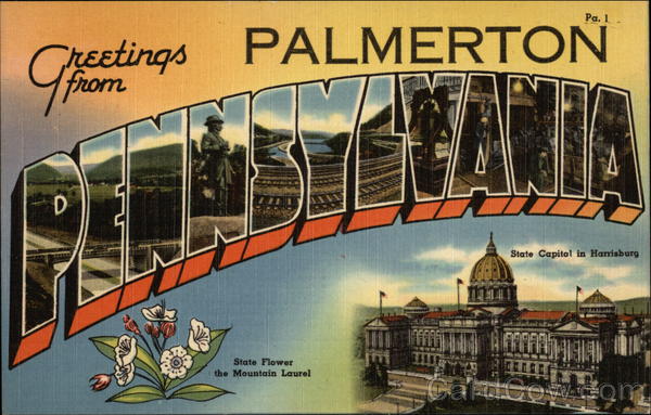 Front: Ρα. 1 CHEetings PALMERTON State Capital in Harrisburg State Flower the Mountain Laurel Back: MADE IN U. S. A PUB. BY R. RAMSAY MEBANE, WILKES-BARRE. PA. 71162