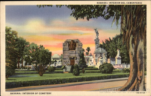 Front: HABANA: INTERIOR DEL CEMENTERIO OB-H1129 HAVANA: INTERIOR OF CEMETERY Back: 95 C. JORDI, OBISPO 526, HAVANA, CUBA MADE IN U.S.A. CHICAGO QUALIT -C.T. ART-COLORTONE Republica de Cuba
