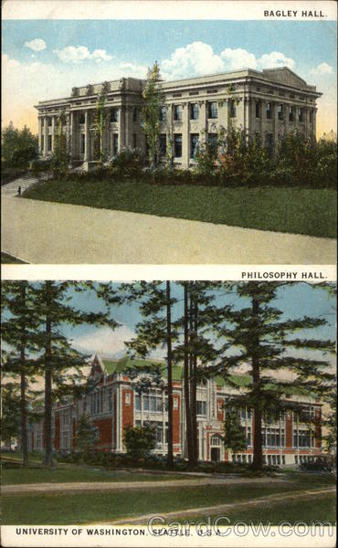 Front: BAGLEY HALL. PHILOSOPHY HALL. Itm UNIVERSITY OF WASHINGTON, SEATTLE, U.S.A. Back: 35 A-87544 PLACE STAMP. HERE AND ISLAND POSSESSIONS, CUBA, CANADA AND MEXICO 3304 PUBLISHED BY C. P. JOHNSTON CO., SEATTLE, U. S. A.