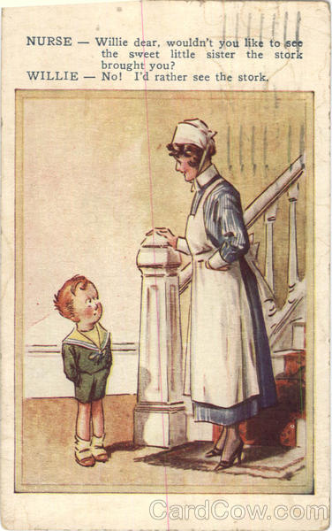 Nurse - Willie dear, wouldn't you like to see the sweet little sister the stork brought you? Willie - No! I'd rather see the stork.