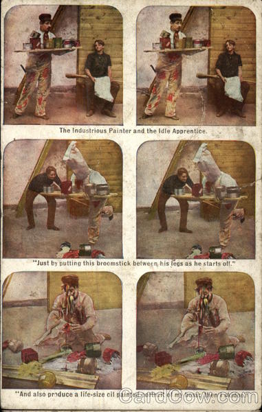 Front: The Industrious Painter and the Idle Apprentice. "Just by putting this broomstick between his legs as he starts off." "And also produce a life-size oil painted portrait of my boss; then'l skidoo." Back: lc here U. S. and 2c Foreign