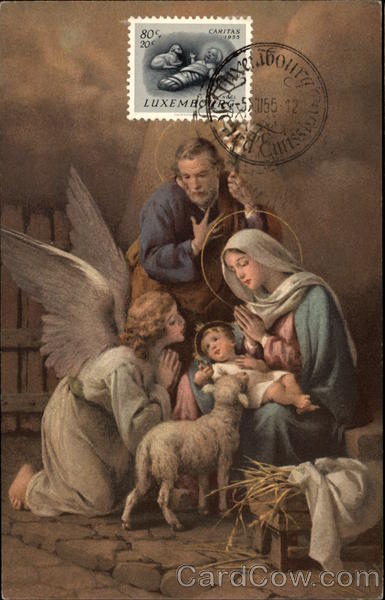 Front: bourd LUXEMBOURG 1155-12 COURVOISI 80 20€ CARITAS 1955 NOEL Chriss Back: 204 B/3 CHAPOLLTE -5X1155-12 uve hrissi your 25% 5c entbe Me -3X455-12- Emissi CARITAS 1955 LUXEMBOURG VOISI T-NICOLAS