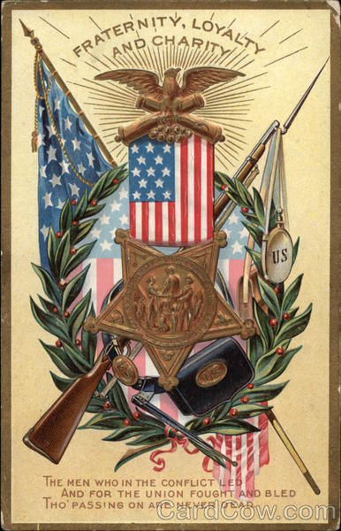 Front: FRATERNITY, LOYALTY AND CHARIT Hit US US THE MEN WHO IN THE CONFLICT LED. AND FOR THE UNION FOUGHT AND BLED THO PASSING ON ARE NEVER DEAD. Back: DECORATION DAY SERIES NOI. Tall her COPR.E.NASH 1910.