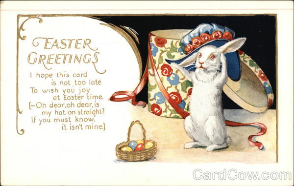 Front: GEASTER GREETINGS I hope this card is not too late To wish you joy at Easter time. (-Oh dear,oh dear, is my hat on straight? If you must know. it isn't mine.] 2 Back: 552 -8.. مور ON THIS SIDE NOW CENT