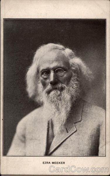 Front: EZRA MEEKER 2018 Back: Born December 29, 1830, in Butler County, Ohio; reared in Indiana; crossed the plains with an ox team 1852 to the Oregon country; 1853 settled nearby where Tacoma was afterwards built; farmer. For address only