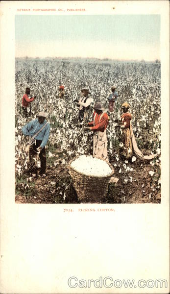 Front: DETROIT PHOTOGRAPHIC CO., PUBLISHERS. 7°34. PICKING COTTON. Back: CD $2. AND CANADA, FOREIGN. Two CENTS.