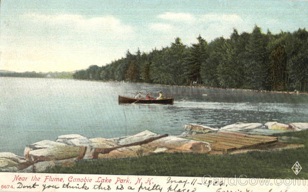 Front: Near the Flume, Canobie Lake Park, NH. N, 6674. Dont you think this is a May-11-1906. "pretty places Back: The Metropolitan News Co., Boston, Mass. Manufacturers of Souvenir Postal Cards. 00 TWO CENTS