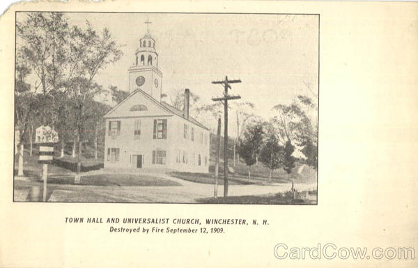 Front: ++ TOWN HALL AND UNIVERSALIST CHURCH, WINCHESTER, N. H. Destroyed by Fire September 12, 1909. Back: CART HERE