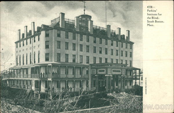 Front: TEETHER 000 0 SHE DDDD Al 1111111111 SCHOOL BUNG SOUVENIR POST CARD CO N.X 4338- Perkins' Institute for the Blind, South Boston, Mass. Back: Post Card-e- TWO CENTS