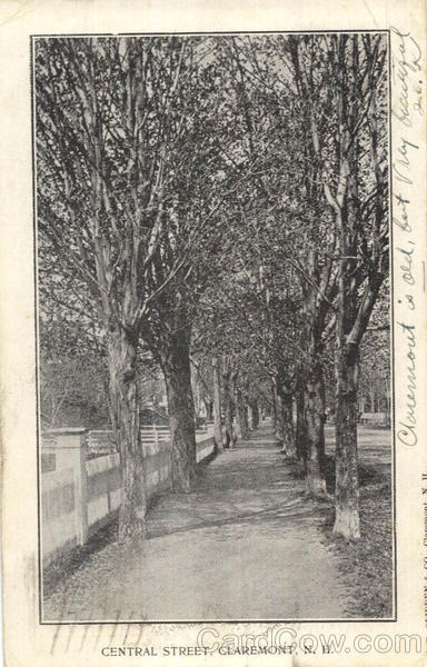 Front: CENTRAL STREET, CLAREMONT, N. H. Claremont N Claremont is old, but Prey beautiful Back: AREMONT 1.50 19 WH. 07 UNITED STATES OF FRANKLIN 1790 Mis. P. Gody st 11 Holmen Glens Falls ny.