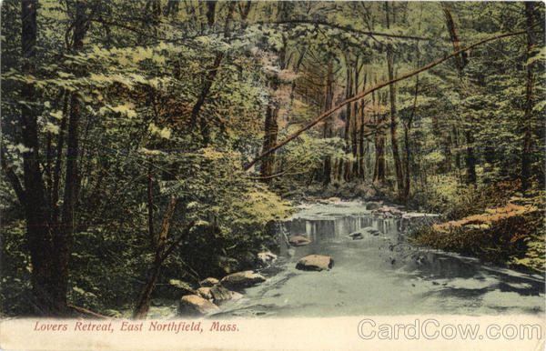 Front: Lovers Retreat, East Northfield, Mass. Back: S. 871144. Published in Germany by A. R. Levering, East Northfield, Mass. 1.50 Place the Stampere One Cent for United States, and Island Possessions Cuba, Canada and For Foreign.