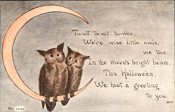 Front: Tuwit Tu-wit tu-woo, We're wise little owls, we Two In the moon's bright beam, This Hallowe'en, We hoot a greeting to you. MHS No 223B Back: THIS SPACE FOR COMMUNICATION Grndma your Bby Cyril OWEN CARD PUB, CO. ELMIRA, N.Y.