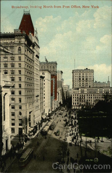 Front: Broadway, looking North from Post Office, New York ACERCE: ***** NIL 1300 210,731. (J.V Back: The Leighton & Valentine Co., N.Y. City. THROUGHOUT TRADE MARK. 13 QUALITY FAMOUS атном зні CARD