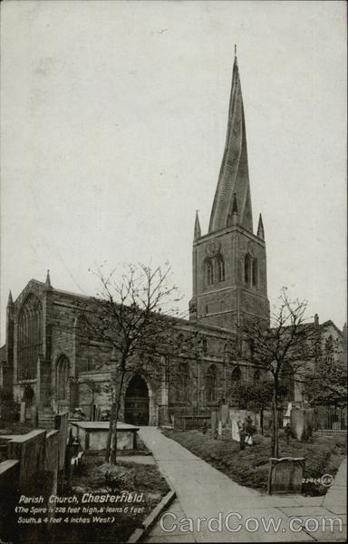 Front: Parish Church, Chesterfield. (The Spire is 228 feet high,& leans 6 feet South,& 4 Feet 4 inches West) 22414 J.V Back: Valentine's Series. This space may be used for Communication here