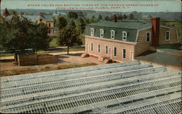 Front: STORE HOUSE AND SECTION THREE OF THE FAMOUS GREENHOUSES OF JOHN LEWIS CHILDS, FLORAL PARK, NY 8 日 2日 日 日 11 10 Back: IMITA CARE QUAM INVIDERE Hab 25 here