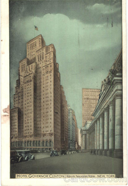 Seventh Avenue at 31st Street opposite Pennsylvania Railroad Terminal Baltimore & Ohio Motor Buses Stop at Door New York City. 1,200 Outside rooms, each with bath, radio, servidor, circulating ice water, full length mirror, and bed. Head leading lamp. Two splendid Restaurants, Coffee Shop and Tavern all cooled by refrigerated air. Dinner and Sapper Dancing in the Balloon room. sample and Display Rooms. High Speed Self-leveling elevators. Garage Service. Rates:- Room for single occupancy $3.00 and up Room for double occupancy $4.00 and up. |