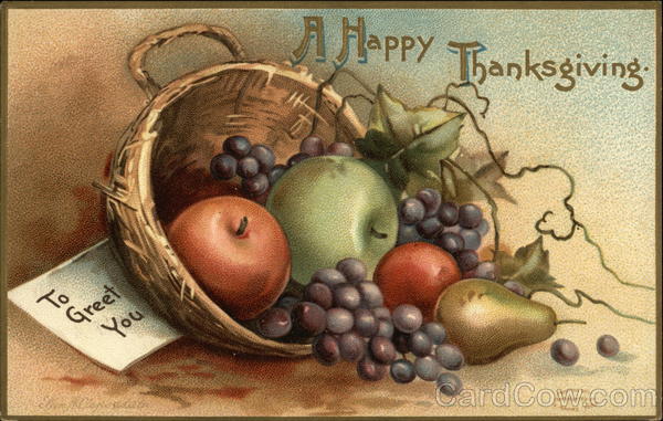 Front: To Greet A Happy Thanksgiving. JH PAINTING ONLY COPYRIGHTED BY GARRE 1909 Back: No 51670 ENTON, NOV 26 11-AM 1909 Martha TRE N. FA Miss Alma Corliss Barne gat N.O gat o