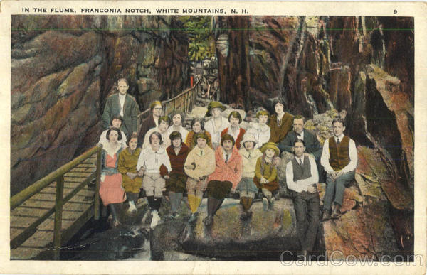Front: IN THE FLUME, FRANCONIA NOTCH, WHITE MOUNTAINS, N. H. Back: PUB BY J. V. HARTMAN & CO., PORTLAND, MAINE, AND TAMPA, FLORIDA. 128125 JV.H.CO From the Mountain Pines of Maine to the Sunny Sands of Florida 304