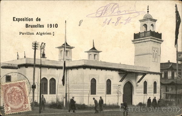 Front: inolona a Exposition de Pavillon Algérien POSTESG Bruxelles 1910 BELG 2 20 2c POSTERIJEN 아 Back: POSTKAART Partie réservée à la correspondance Adresse du destinataire Mr. L. Gonsion Abbesill France