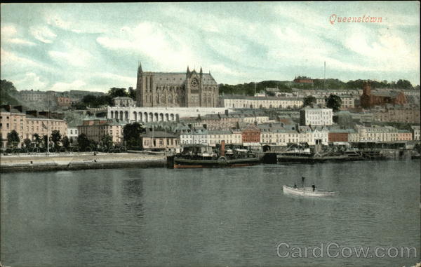 Front: EFF je p FOT ulatu *15:10A 11 amba AMALA DEA Queenstown TH Walen www Back: TRE L. COUGHLAN, AS ASIS Newsagent, Bookseller, Fancy Stationer, etc., 10 Harbour Row, Queenstown. Bog Oak, Views of Irish Scenery N and Post Cards.