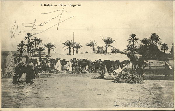 Front: 7. Gafsa. Dev Mat L'Oued Bayache 值 Back: Ce côté est exclusivement réservé à l'adresse Cliché Jay, Gafsa 2834 POSTES Mademoiselle Odette Barlidon 21 Passage hathaile REGENCE (5 LETENTS 1SCASSE INVAIVEN I MOVE NAT