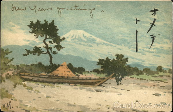 Front: New Years greetings.. K.M. 才 Back: 行発堂利便鄉本京東 BENRIDO HONGO, TOKYO BY Union Postale Universelle. Thank you very much for your kind thought in sending the Christmas معصية مرصد السيدية Talous 150 堂利便 Miss Hathaw きか