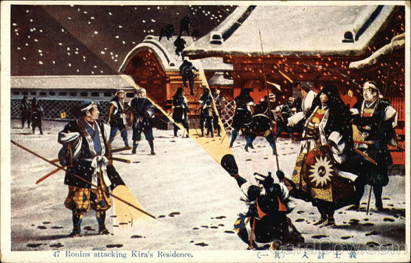 Front: 47 Ronins attacking Kira's Residence. (一其) 入討士 義 Back: 製堂美向京東 UNION POSTALE UNIVERSELLE. 1000 きかは便郵
