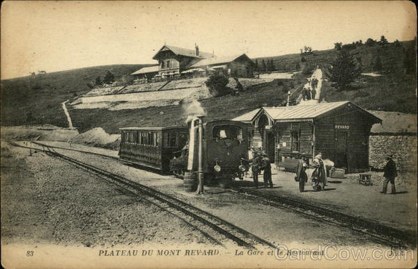 Front: 83 PLATEAU DU MONT REVARD. La Gare et le Restaurant. REVARD Jhot. Back: ANCIENS ETAB. NEURDEIN ET CIE. E. CRETÉ, SUCC., CORBEIL-PARIS 52, AV. DE BRETEUIL. - PARÍS. Carte Postale