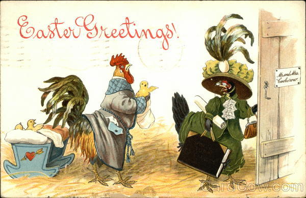 Front: Easter Greetings Mr. and Mrs. Cockcrow. Back: THI SPACE FOR WRITING MESSAGES Harris come the 19th and bring the family. Llo 252.-5007 Kathy 62672 104 200 SEWPORT 7-PM 1912 13N Pa Mr. R.H. S Carplay. 368-70 Washington St. Boston, Mass.