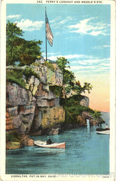 Front: 242 PERRY'S LOOKOUT AND NEEDLE'S EYE, GIBRALTAR, PUT-IN-BAY, OHIO 29469 Back: PUBLISHED BY E. B. ACKLEY, SANDUSKY, OHIO C. T. AMERICAN ART COLORED CHICAGE 758 HERE