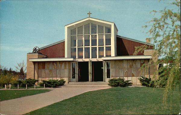 CHURCH "OUR LADY QUEEN OF MARTYRS" Woonsocket, R.I. "Lusterchrome" REG. U.S. PAT. OFF. MADE ONLY BY TICHNOR BROS., INC., BOSTON 15, MASS. AV. TAMP K-7257