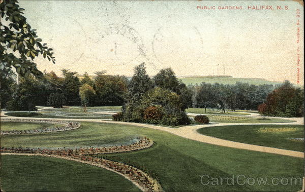 Front: ** PUBLIC GARDENS. HALIFAX, N. S. Montreal Import Co. Montreal No. 920 Back: POSTE CARD. RO RE PRING AM SP FEB 5 Great Britain and Italy this space may ge FE used for communication. 07 MASS Mis Bertha Joff Attleboro Mass. CENT