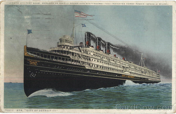 Length 470 feet beam, Moulded 56 feet 7 decks - 600 staterooms 7600 indicated horse power speed 21 miles.