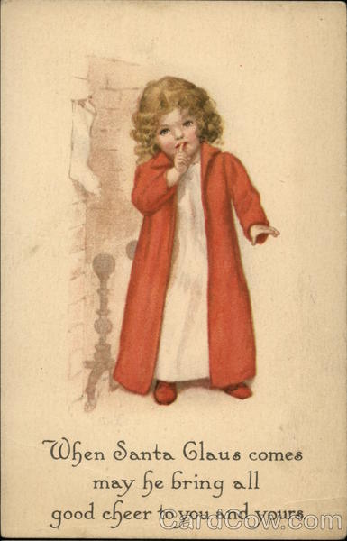 Front: When Santa Claus comes may he bring all good cheer to you and yours. Back: PUBLISHED BY THE GIBSON ART COMPANY CINCINNATI 6756 IBSON LINES TWO CENTS
