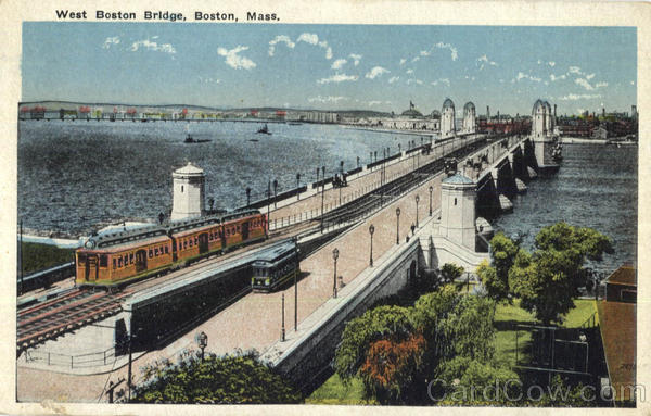 West Boston Bridge, Boston Bridging the Charles river, connecting Boston and Cambridge. A beautiful granite structure, over which pass some of the cars to Cambridge, the home of Harvard University.