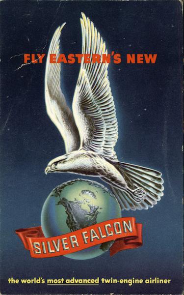 Front: FLY EASTERN'S NEW SILVER FALCON the world's most advanced twin-engine airliner Back: The SILVER FALCON was built for Eastern by the Glenn L. Martin Company to bring you the highest degree of dependability. 44-PO-27