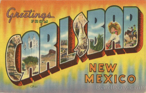 | A beautiful city is Carlsbad, tucked away in the elbow of the Pecos River. Carlsbad had water to make flowers and trees. It has the enchantment of the world's largest and most spectacular caverns; it has America's only potash mines; and above all, it has hospitality - plus a fresh water bathing beach, fishing, hunting and boating - Modern hotels and camps. |