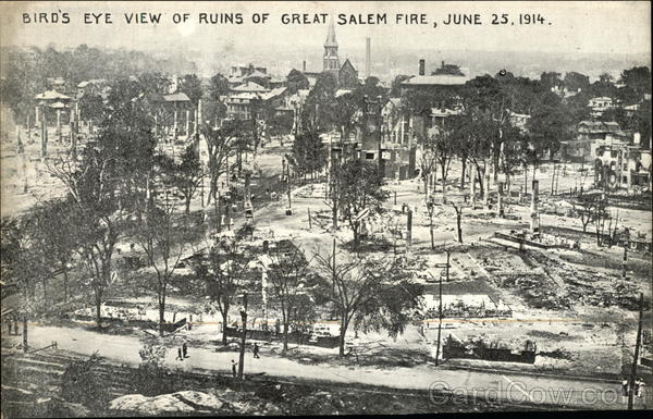 Front: BIRD'S EYE VIEW OF RUINS OF GREAT SALEM FIRE, JUNE 25, 1914. 11 9 Back: Mfd. by Tichnor Bros., Inc., Boston, Mass. 13 SPACE FOR WRITING MESSAGES 30 WAVE PLACE THIS SPACE FOR ADDRESS ONLY