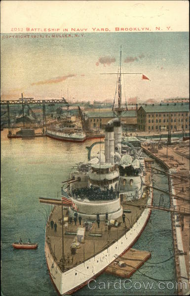 Front: 2042 BATTLESHIP IN NAVY COPYRIGHT 1904, E. MULLER, N. Y. YARD, BROOKLYN, N. Y. Back: چی DOMESTIC AND Two CENTS