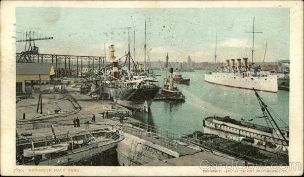 Front: 7630. BROOKLYN NAVY YARD. AUR 18 COPYRIGHT, 1904, BY DETROIT PHOTOGRAPHIC CO. Back: POSTOL ARD 7-PM 19 06 WH 13 4- Mr James. Jerone. dexington مشهد AND CANADA, FOREIGN, Two CENTS. Stan Charles Torons этное, 1 *****
